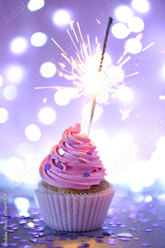 Cupcake with pink cream icing and sparkle on a glitter background, close up