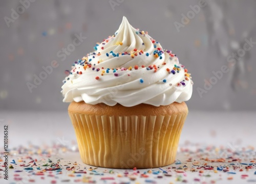 Cupcake with swirled white frosting and colorful sprinkles on top , frosted treat, food decoration, dessert toppings