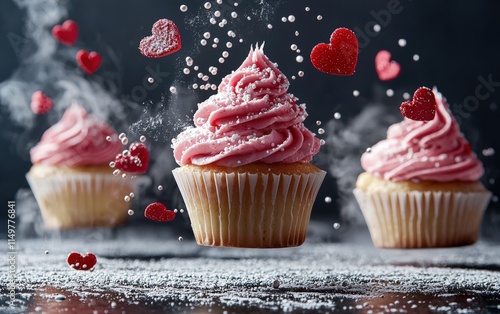 Cupcakes levitating with swirling icing and edible decorations floating