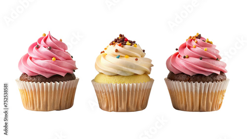 Cupcakes with frosting, vanilla and strawberry, and sprinkles, on transparent background