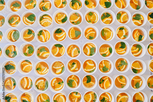 Cups of orange lemonade with mint. Catering, background