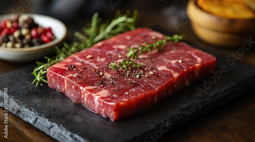 Cured beef steak garnished with fresh herbs and spices on dark stone background