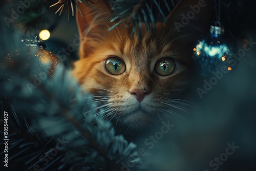 Curious cat peeking through Christmas tree decorations. Holiday pet concept.