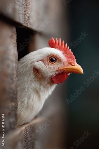 Curious chicken peeks through wooden coop, showcasing vibrant fe