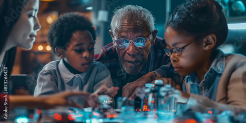 Curious Children Learning Advanced Technology with a Grandparent in a Modern Classroom
