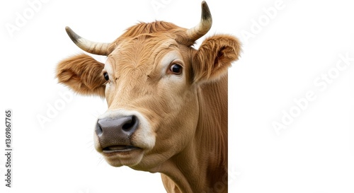 Curious Cow Portrait - Close-up of a light brown cow's face, slightly surprised expression, isolated on white background