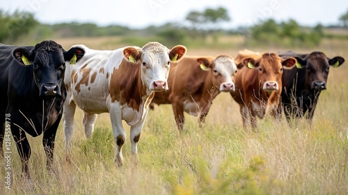 Curious cows standing together in green pasture looking at camera in bright farm setting : Generative AI