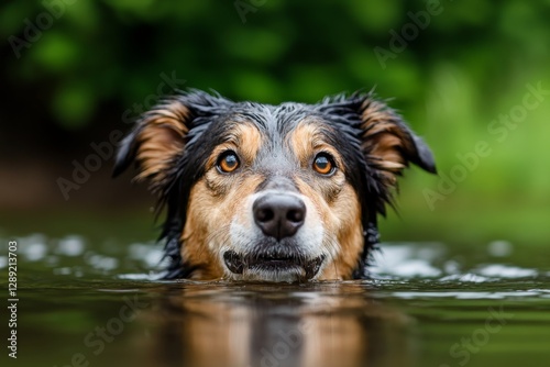 Curious dog swimming in a serene lake surrounded by lush greenery on a sunny day