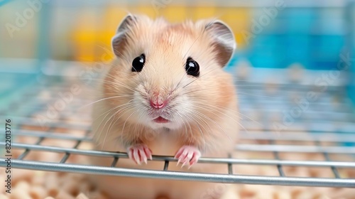 Curious hamster energetically looking for food in intricate maze like cage habitat