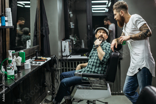 Curious man turning while talking to the barber