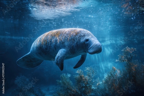 Curious manatee swimming gracefully in the peaceful waters of a vibrant underwater habitat during a bright sunny day