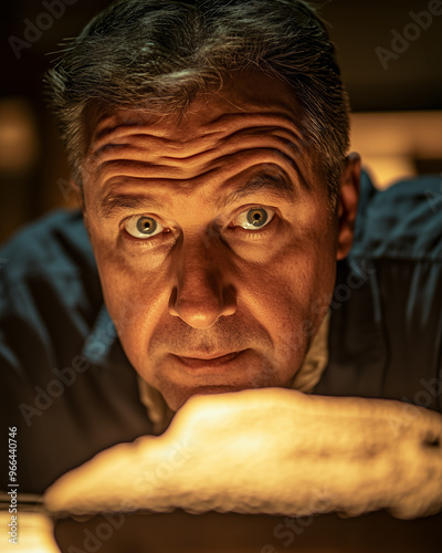 Curious Middle-Aged Man Examining an Object Under Warm Light