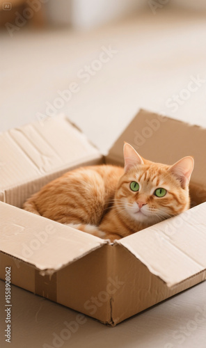 Curious Orange Tabby Cat Snug in a Cardboard Box – Adorable Indoor Moment