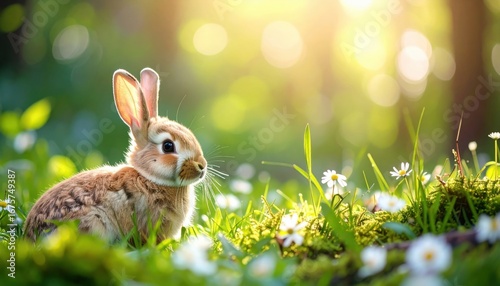 Curious rabbit exploring a sunlit meadow nature scene wildlife photography tranquil environment close-up view serenity and playfulness