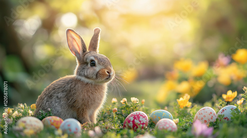 Curious rabbit in a meadow surrounded by colorful Easter eggs