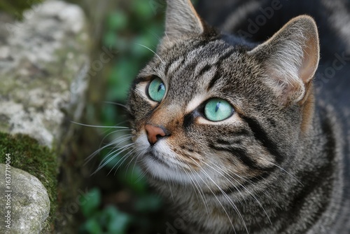 Curious tabby cat gazing upward in a lush green garden during daylight hours