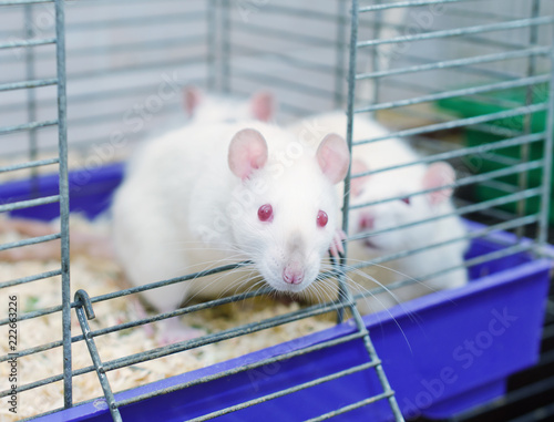 Curious white laboratory rat looking out of a cage in a laboratory (in blue tones)