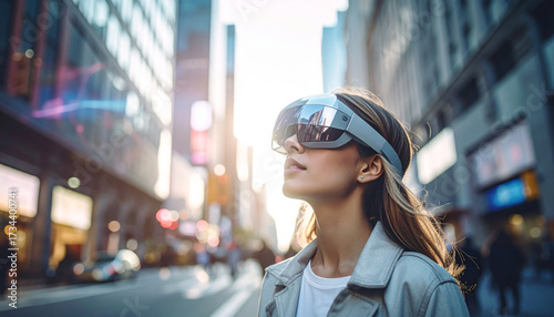Curious woman wearing augmented reality glasses explores future city street, amazed by digital technology innovation