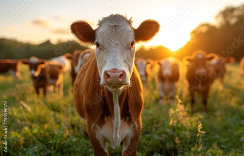 Curious young calf looking at the camera while standing in grassy pasture during sunset