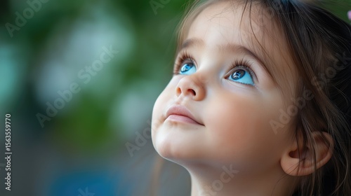 Curious Young Child Looking Upwards in a Green Outdoor Setting