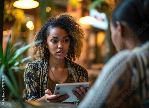 Curious young woman using tablet in cozy café environment.
