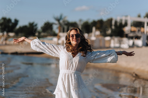 Curly brunette, beautiful happy smiling young woman walking in sunglasses on water in sea, ocean on island beach at sunset in white sarafan, dress. Photography, portrait.