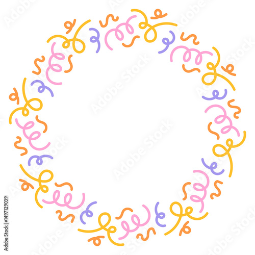 Curly Confetti Joy Frame. Circular fun border formed from playful spirals and curls in party shades. Vector illustration for card and invitation