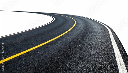 Curved asphalt road with painted lines, isolated on white background, perspective