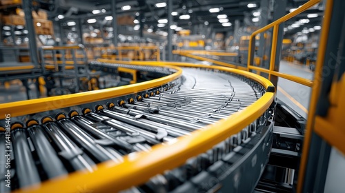Curved conveyor belt system in a modern industrial factory setting. Ideal for demonstrating automation, manufacturing processes, and logistics.