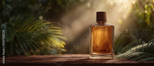 Curved Glass Perfume Bottle on Polished Wood Surface in Nature Light