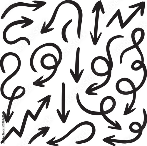 Curved Hand Drawn Arrow Icons Collection – Zigzag, Spiral, Loop, Wavy, and Squiggly Directional Vectors for Creative Design, Navigation, and Visual Flow Charts