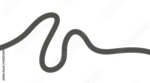 Curved road with yellow and white markings isolated on white background. Straight asphalt road.