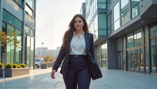 Curvy woman in business walking through modern office complex