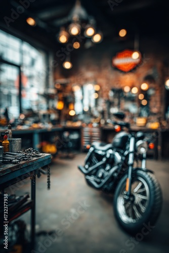 Custom motorcycle showcased in a brightly lit workshop with tools and equipment around during the day