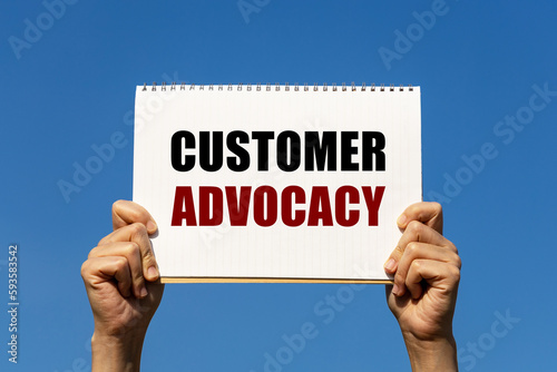 Customer advocacy text on notebook paper held by 2 hands with isolated blue sky background. This message can be used as business concept about customer advocacy.