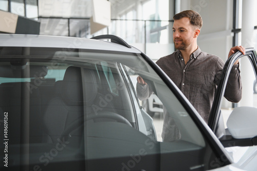 Customer choosing new car in dealership showroom