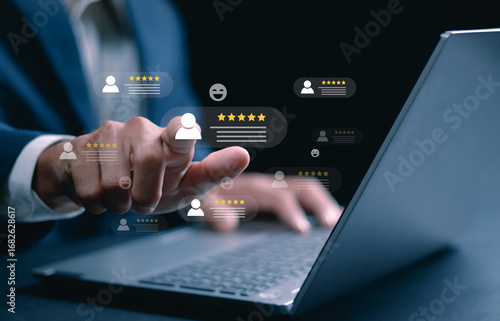 Customer feedback and review good rating concept, person in a business suit interacting with floating digital 5-star customer reviews. testimonial and testimony, user comment and feedback for review.