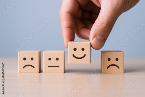 Customer Feedback: Hand Selecting Positive Emotion Wooden Block Among Negative Emotions Illustrating Satisfaction
