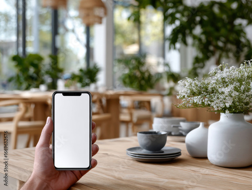 Customer holding smartphone mockup with blank screen in cozy restaurant