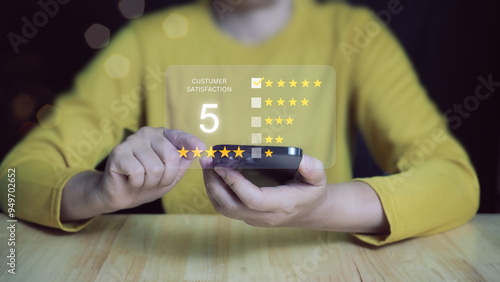 Customer review satisfaction feedback survey concept, User give rating to service experience on online application, Customer can evaluate quality of service leading to reputation ranking of business.