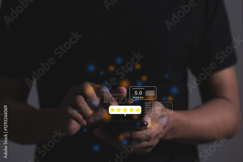 Customer Review, Young Man hand holding Smart Phone with five star to review and give 5 stars with very good results in service, Good review 5 star rating choice feedback