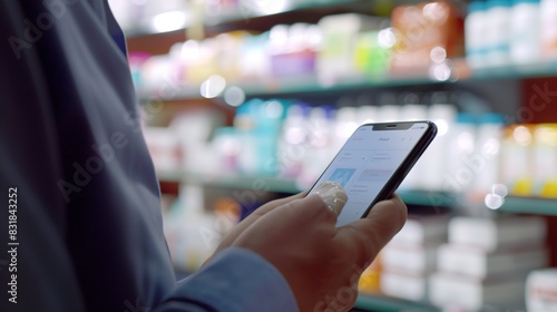 Customer reviewing a medication app on a smartphone in a pharmacy, close-up, screen glow
