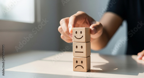 Customer satisfaction and emotional intelligence concept with wooden blocks showing smile, neutral, and sad face icons