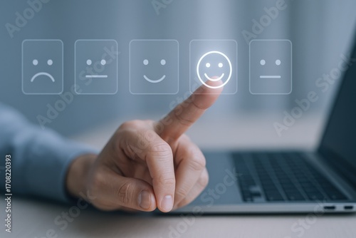 Customer Satisfaction Survey: Hand Selecting Happy Smiley Face on Virtual Interface with Laptop