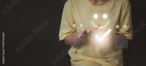 Customer service and Satisfaction concept: Customer people touch the smartphone on the happy Smiley face icon to give satisfaction in service. rating very impressed.