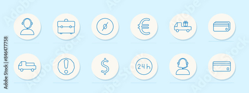 Customer service set icon. Headset, briefcase, compass, euro, delivery truck, credit card, alert, dollar, 24 hours, support agent. Customer support, finance, logistics concept. Vector line icons
