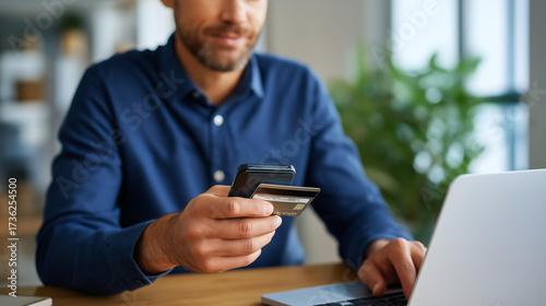 Customer verifying secure online purchase using credit card and smartphone at office desk with laptop for e commerce transaction online purchase credit card verification