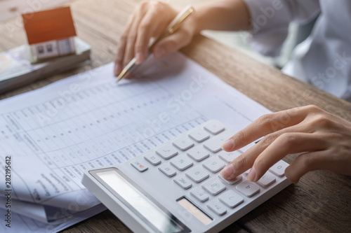 Customers use pens and calculators to calculate home purchase loans according to loan documents received from the bank. real estate concept.