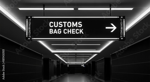 Customs Bag Check Sign Directing Passengers, Airport Or Commercial Building