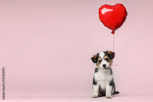 Cut fluffy playfull puppy playing with a heart shaped red valentine balloon with copy space room for text